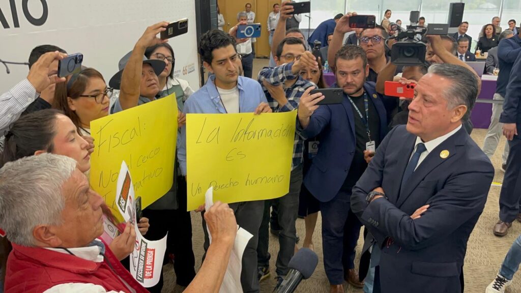 La protesta ocurrió en el Congreso del Estado de Guanajuato, donde el fiscal acudió para comparecer ante diputadas y diputados con motivo del análisis de su informe anual de actividades. Antes de iniciar la sesión, periodistas se colocaron frente al funcionario para señalar las dificultades que enfrentan para obtener información oficial sobre investigaciones y casos de alto impacto.